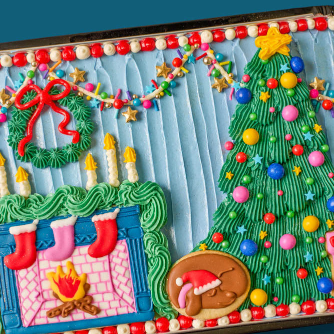 Ooooh, baby it’s cold outside! Come warm up with us at the studio and snuggle up to our Cozy Christmas Deluxe Happy Hour, where holiday cheer is always served with a side of sparkle. The ultimate 2-for-1 workshop; part cake decorating, part cookie decorating, 100% fun. This 7x11 Chocolate Fudge sheet cake with peppermint cookie crunch serves up to 12 people and can be stored in the refrigerator for one week after assembled or in the freezer for up to 1 month.
