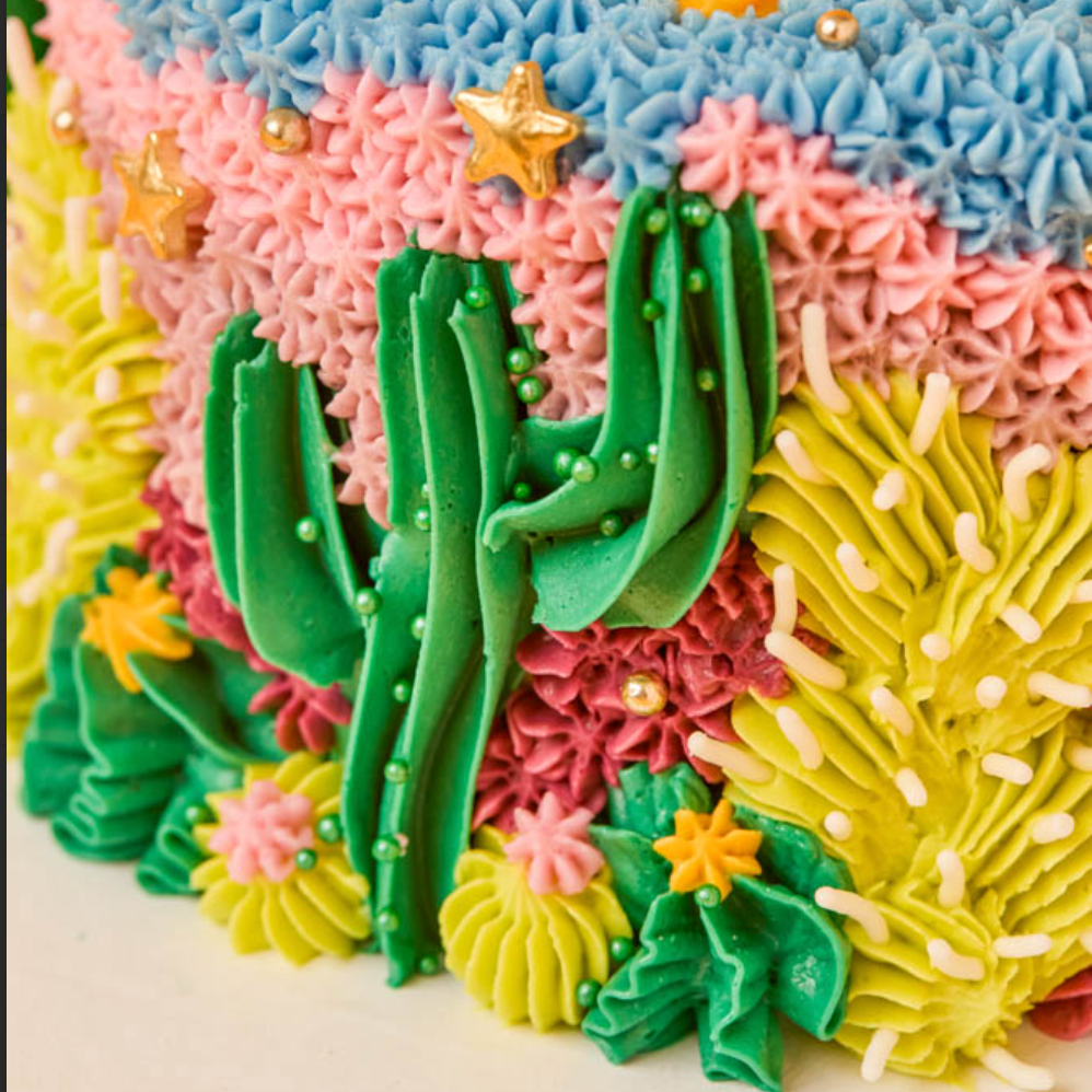 This class will have you dreaming of warmer, sunnier days! Topped off with some fluffy clouds you'll feel like floating away to a pool in Arizona. In this 3 hour cake class you will become a piping pro and cover your 6 inch lemon cake with cookie crunch filing with a variety of desert sunrise essentials and spiky cacti to boot.